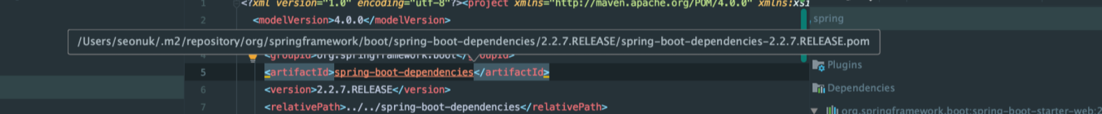 해당 파일로 가게되고 또 부모로 spring-boot-dependencies를 모시고 있는 것을 볼 수 있습니다. 여기서 한번 더 들어가면