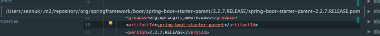 여기서 parent 태그를 보시면 spring-boot-starter-parent를 가지고 있는 것을 볼 수 있습니다. 말 그대로 해당 스타터를 부모로 가지고 있다고 보면 됩니다. 여기서 (command + 클릭)을 하면