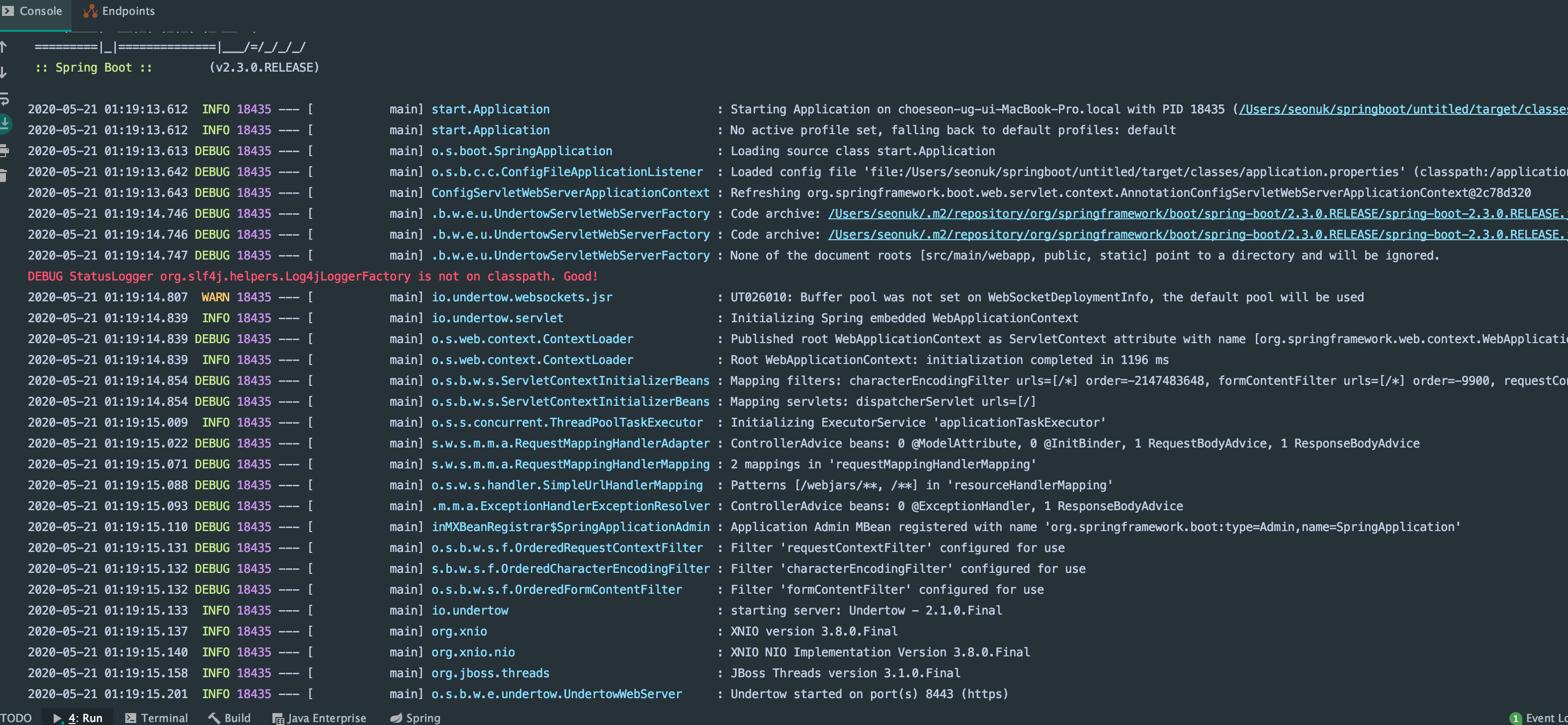 실행화면을 보면 Info level의 로그들만 찍혀있는 것을 볼 수 있습니다.