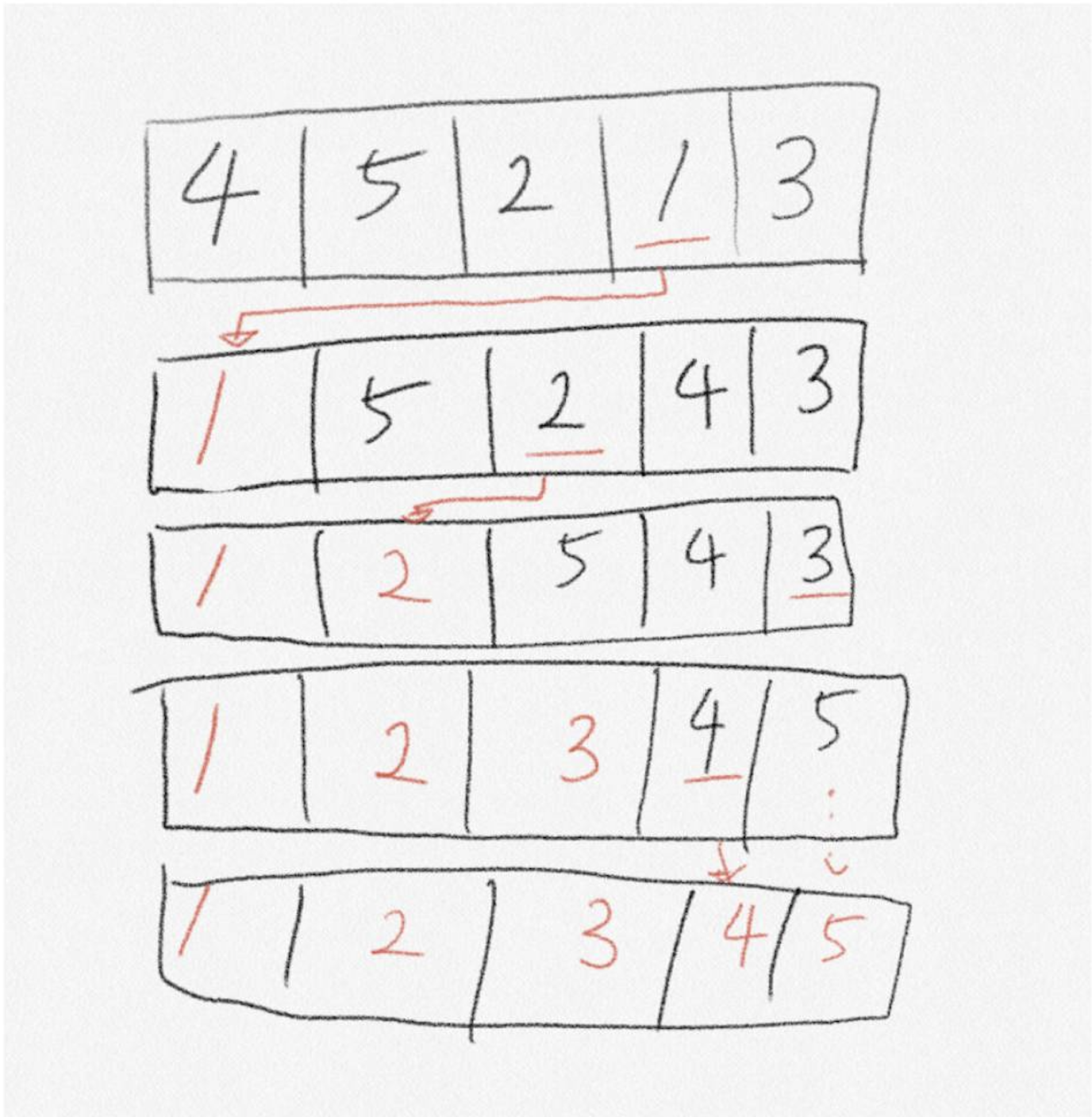 위 그림에서 보다시피 정렬되지 않은 부분에서 최소값을 찾아 앞으로 보내 차례대로 정렬하는 것입니다.
